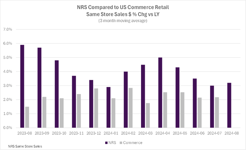 Over the past twelve months, the NRS network’s three-month moving average same-store sales have outpaced the US Commerce Department’s Advance Monthly Retail Trade data, excluding food services, by 3.0% percentage points, on average.